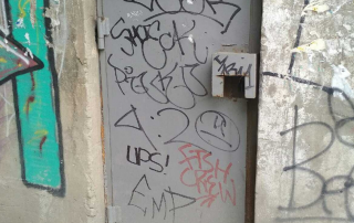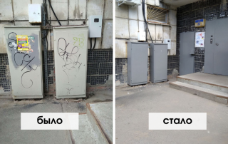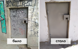 Но на ул. Газеты Звезда, 35 стереть теги не получилось, пришлось закрашивать. Причем так увлеклись, что покрасили двери подъездов. В два слоя.