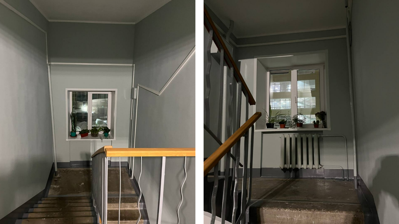 В январе закончили ремонт первого подъезда на ул. Монастырской, 87. Сначала сняли старую краску и штукатурку — убрали все покрытие до кирпичей. Затем уложили новый слой штукатурки, выровняли стены. Когда покрытие высохло, нанесли водоэмульсионную краску до потолка. Потолок выкрасили такой же краской, но в белый цвет.