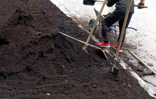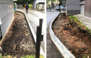 Обычно мы привозим землю для клумб весной или осенью. Весной сразу распределяем по газонам и засаживаем декоративными растениями, а осенью – чтобы все было готово к посадке цветов, когда сойдет снег. На ул. Соловьева, 11 мы завезли чернозем несколько