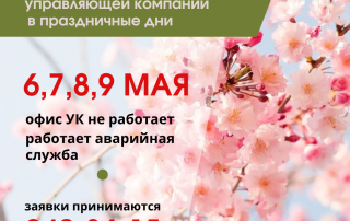 Уважаемые жители! Впереди праздничные выходные - самое время напомнить о том, как работает управляющая компания в эти дни. 6,7,8,9 мая - офис управляющей компании не работает, но аварийная служба принимает заявки в круглосуточном режиме. телефон аварийной службы: 240-36-15