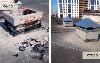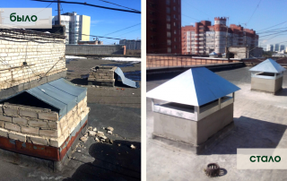 На прошлой неделе мы закончили работы по восстановлению вентиляционных шахт на ул. Малой Ямской, 2а. Выступающая над крышей часть была уложена очень странно – кирпичи лежали то так, то сяк. А крышки, защищающие шахты от осадков и мусора, почти не